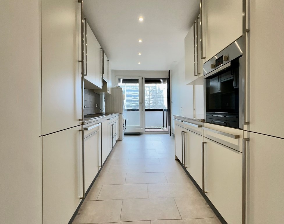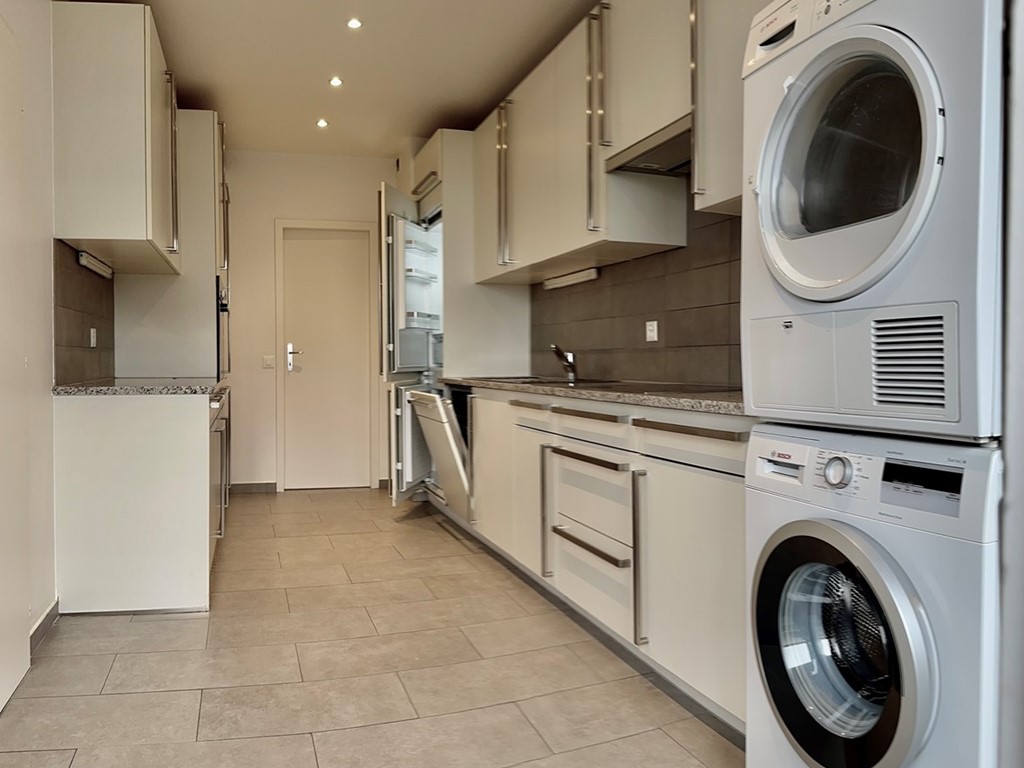 Cuisine fermée, entièrement aménagée avec des équipements modernes, incluant une colonne lave-linge/sèche-linge et un accès direct au balcon.